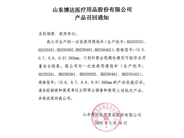 • 山東博達醫療用品股份有限公司 產品召回通知...